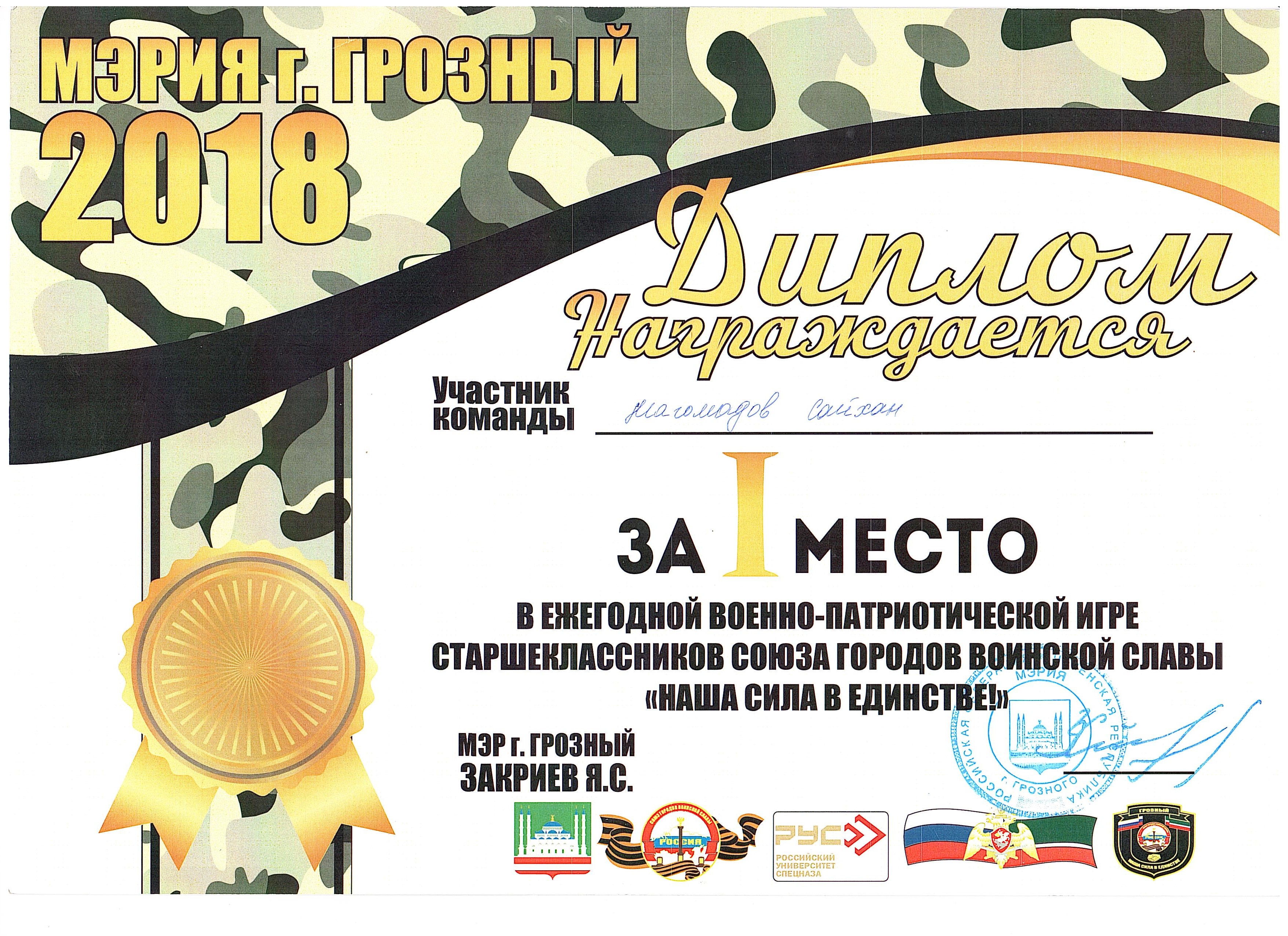 Магомадов Сайхан учащийся 11 класса награжден дипломом Мэрии г. Грозный за 1 место в ежегодной военно-патриотической игре страшеклассников союза городов воинской славы "Наша сила в единстве!".